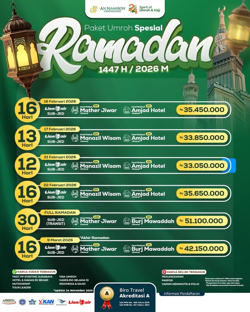 UmrohBersama.com merupakan mitra resmi PT An-Namiroh Group yang beralamatkan di Malang, sebuah penyelenggara perjalanan umrah terpercaya dengan rekam jejak pelayanan yang amanah dan profesional. Kami adalah tim berpengalaman yang fokus dalam merencanakan serta menyelenggarakan perjalanan umrah yang berkesan dan penuh makna bagi setiap jamaah. Dengan layanan yang lengkap—mulai dari pengurusan tiket pesawat, pemilihan hotel yang nyaman dan dekat dengan Masjidil Haram maupun Masjid Nabawi, hingga pendampingan ibadah oleh mutawwif berpengalaman—kami memastikan setiap tahap perjalanan Anda berjalan lancar, aman, dan penuh ketenangan.